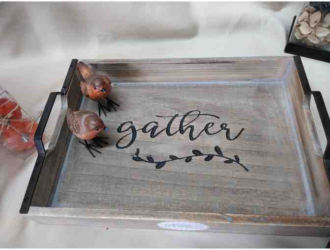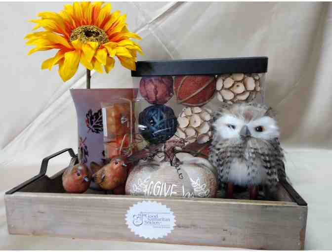Falling leaves and crisp mornings are a sign that fall is here. Bring the beautiful colors of the seaon inside with this package featuring a great, versatile tray, soft, fluffy owl, pumpkins, fall-inspired vase, baby birds and a cute "Give Thanks" pumpkin.