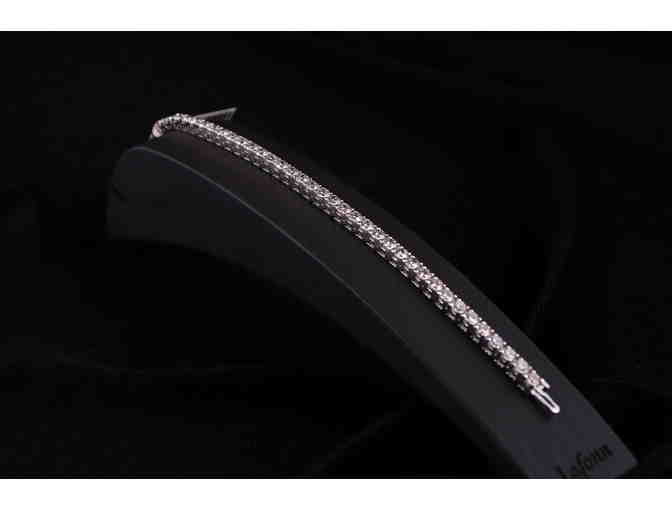 18K white gold four prong continuous link tennis bracelet. Each link is set with one G-H color, S I clarity, round brilliant cut diamond.