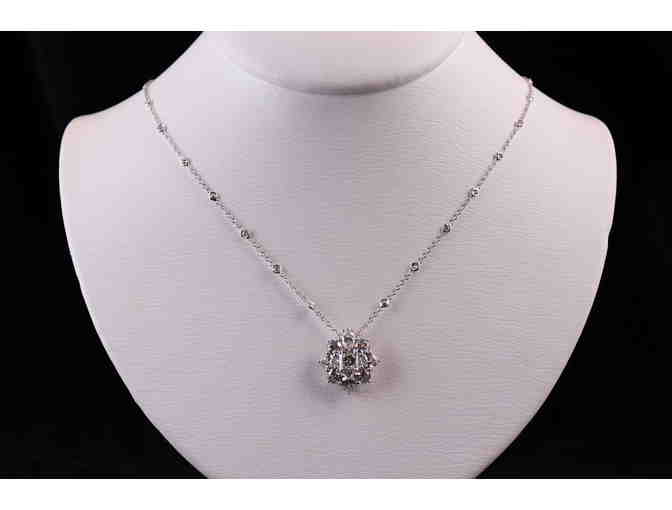 J.B. Star platinum necklace featuring a link neckchain with evenly spaced full bezel settings each set with one F-color, VS clarity, full-cut diamond. The necklace features a cluster pendant in a snowflacke design set with one E-color, VS clarity, 1.01 ct round brilliant cut diamond accented with E-F color, VS clarity, oval and round diamonds. The entire necklace has a combined total diamond weight of 4.35 cts.