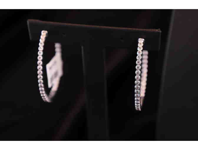 14K white gold large round hinged inside-out hoop earrings. The earrings are pave set down the front and bead set up the inside back with F-G color, VS clarity, full-cut round diamonds. The diamonds have a total weight of 1.93 ct.
