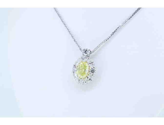 A stunning necklace created in platinum by J.B.Star which features a pendant set in the center with one beautifully cut 1.56ct. oval natural yellow diamond certified fancy intense by the GIA.  The yellow diamond is surrounded by four oval diamonds alternating with four round diamonds and a single round diamond accents the bail.  The accent diamonds are F-G color, V S clarity, and have a combined total weight of 1.48ct.