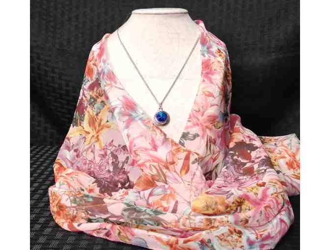 Add the colors of fall to your wardrobe with this sophisticated silver necklace with blue/purple stone pendent and Roby Foulards floral scarf. The scarf is a soft jersey perfect for adding to a sweater.