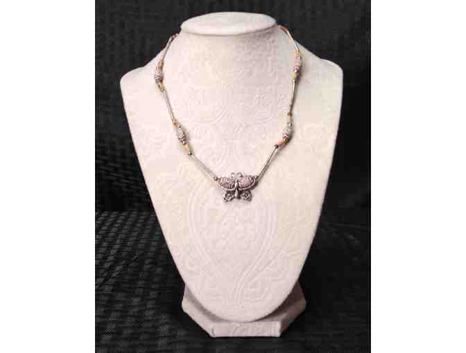 Let your Bohemian nature fly with this great butterfly necklace feauturing silver beading and mauve and tan tones. Display is not part of the package.