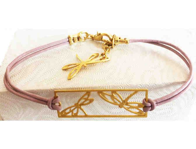 This lovely 7" bracelet is handcrafted in Hawaii by Leighton Lam Designs and features a pair of gold-dipped dragonflies on the front, and a dangling gold dipped dragonfly on the clasp. The bracelet is made with US leather.