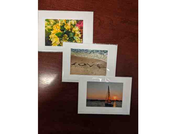 A set of three notecards illustrated with flowers, a sandy beach, and a sailboat