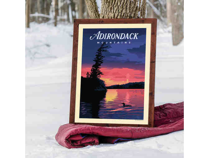 This illustration depicts a sunset view from one of the islands on Middle Saranac Lake. With the lone towering pine and an iconic Common Loon also featured, this poster print presents a truly classic Adirondack scene.