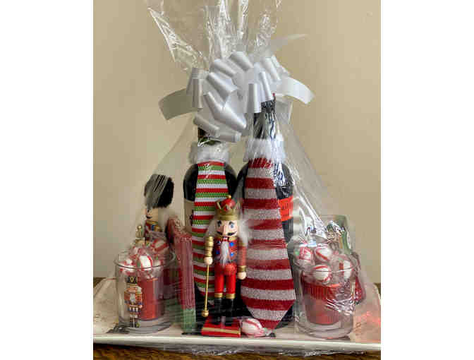 Nutcracker decor, Holiday ties, wine and glasses, candles, soap and candy on a decorative ceramic serving tray.