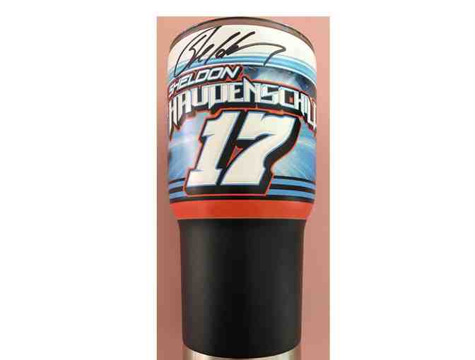 Signed insulated beverage container by Sheldon Handenschild - World of Outlaws Sprint Car Series driver andcar owned by Stenhouse/Marshall Racing Team
