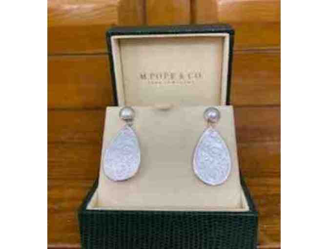 Beautiful Sterling Silver and embossed Mother of Pearl Drop Earrings. These earings are hand made in Massachusetts.