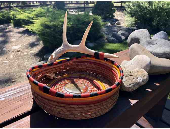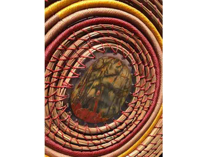 Every pine needle basket is made using the same simple technique, stitching a continuous coil of pine needles to itself. In the beginning these baskets were made for practical purposes but have now turned into an art. Julie used long pine needles from Carolina averaging about 12 inches in length. They are wrapped with a Brazilian waxed polyester cord. The stone center of this basket came from a woman in Cheyenne, Wyoming who collects rocks worldwide and cuts them into slices then sets them in resin. Each basket takes about 40-50 hours to complete. As Julie created her baskets she began by coiling the needles and as she said "the basket starts to talk to you". This is truly a one of a kind piece of art.