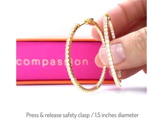 A stunning pair of hoop earrings with micro-pavé stones inside and out and our signature press & release safety clasp. Fine craftsmanship and Italian design. Solid sterling silver with heavy gold plating and highest quality zirconium (great alternative to diamonds). They measure 1.5 inches in diameter. Hypoallergenic. Lightweight.