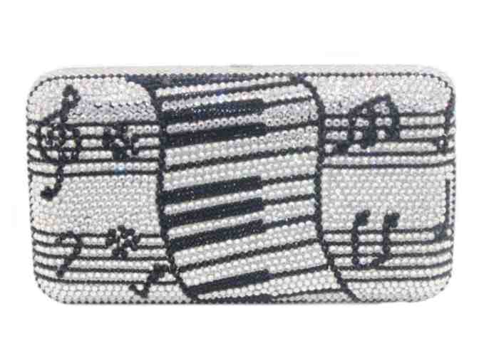Inspired by Elton - This bag was inspried by the music of Elton John featuring treble and bass clef, notes and a piano keyboard crafted with black and silver Swarovski Crystals on both sides of the bag.