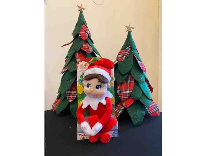 Plushee Elf on a Shelf and 2 Tabletop Trees