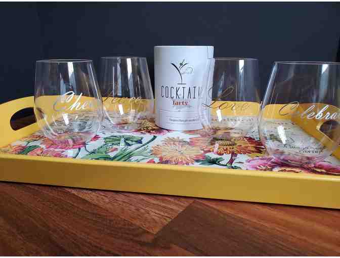 4 stemless plastic wine glasses, fun adult game, and botanical tray!