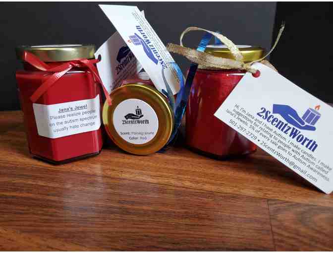 3 Candles: 2 pomegranate, 1 Cinnamon stick. Jana's Jewels makes these candles and donates a portion of the proceeds to Autism Awareness
