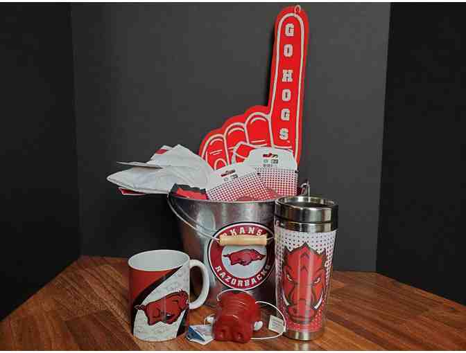 Cheer on the Hogs with this bucket filled with 2 kitchen towels, coffee mug, tumbler, 2 cookies, 1 hog hand, and the notorious hog nose!