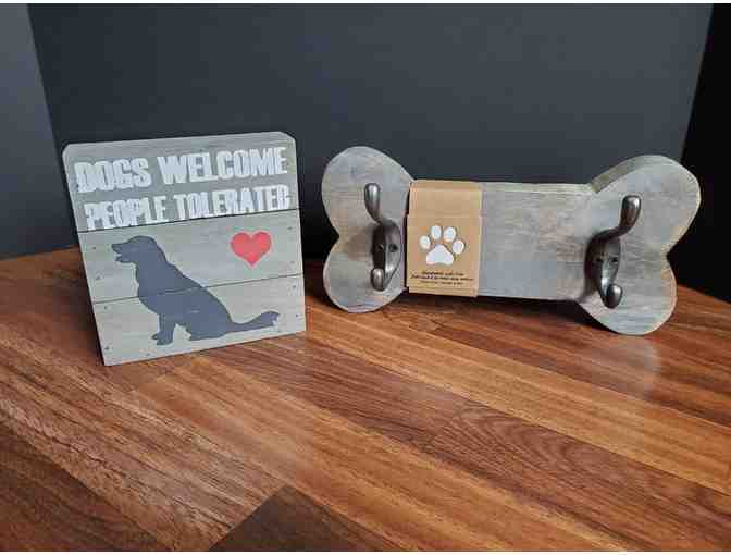 This cute decorative set is perfect to express your love for your best friend! Included the clever sign and wooden dog bone hooks!