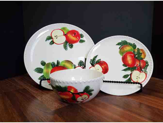 This set includes 4 dinner plates, 4 dessert or bread plates, and 4 bowls. If you win these they are sure to be the apple of your eye!