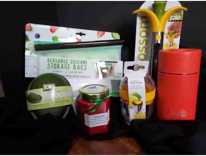 Get this basket for all those clever kitchen hacks! Included: avacado storage pod, reusable silicone storage bags, pineapple corer and slicer, ceramic mug, citrus juicer, and a 2Scentzworth candle!