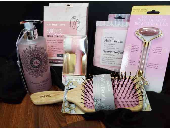 Decrease stress and wrinkle lines with this basket! Included: rose quartz beauty roller, paddle brush, detoxifying foot pads, face brush, lotus and rose cream soap, and microfiber hair turbans!