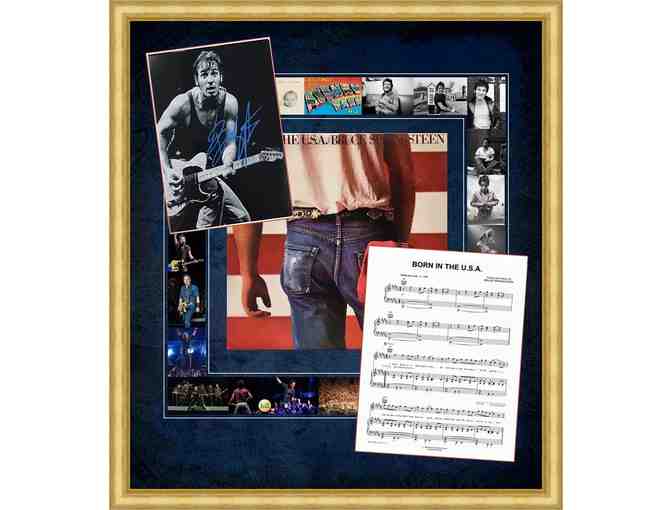 Framed collage commemorating Springteen's music. Hand signed by Bruce Springsteen.