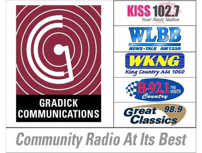 Promote your business or organization through the theater of your mind--Gradick Communications-Community Radio at its best! (100) 30 second commercials on any of the 5 stations: B92 Country, KISS 102.7, Great Classics 98.9, WLBB 1330 AM and WKNG King Country 1060 AM The Legend.