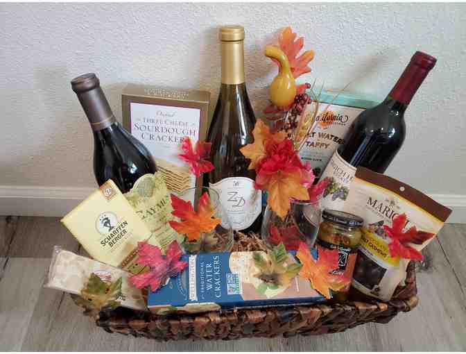 Basket includes a bottle of Chardonnay from ZD Wines, a bottle of Cabernet Sauvignon from Caymus Vineyards, a bottle of Cabernet Sauvignon from Grgich Hills Estate, and a variety of snacks.