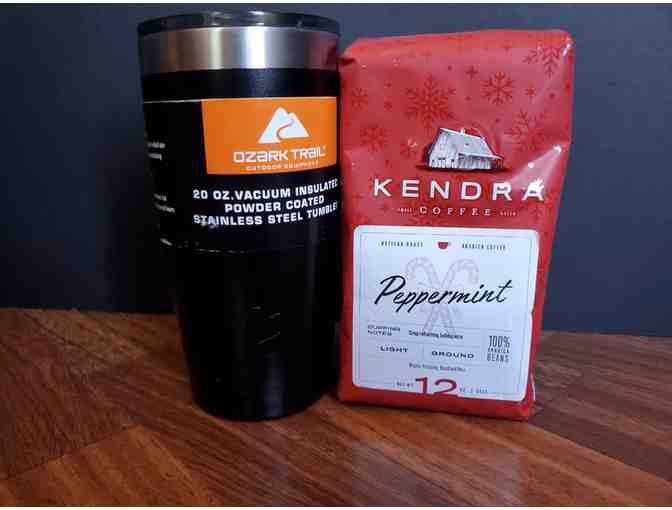 Travel with this 20oz coffee cup full of Christmas cheer peppermint coffee! Item includes 20oz travel mug and 12oz bag of Kendra Coffee peppermint light roast.
