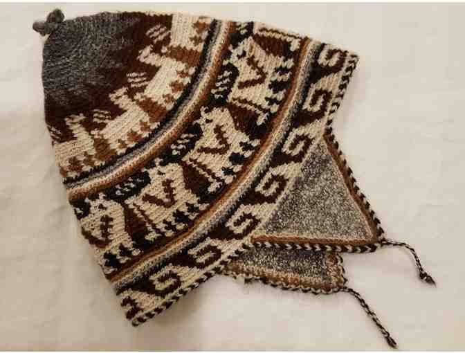 Wool cap features intricately stitched llama motif in grey, brown, beige and black.