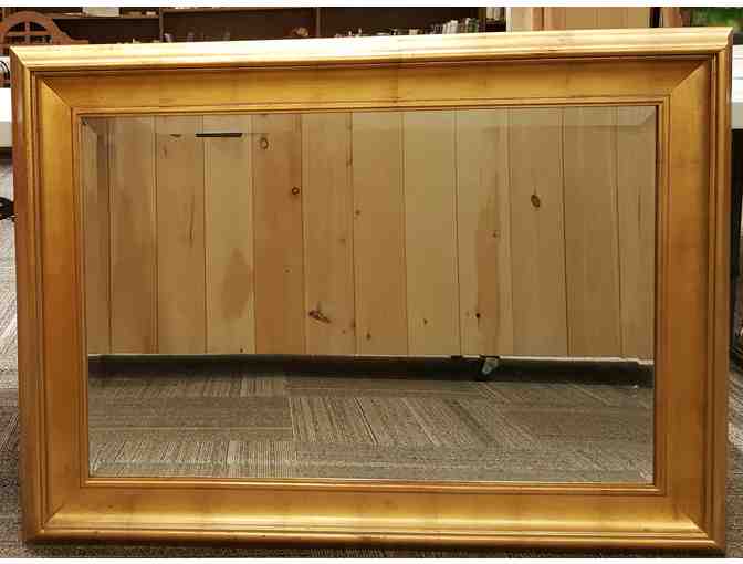 Do you have just the right space in your home or office for a large decorative mirror? This rectangular mirror has beveled glass and a generous gold leaf frame.  Horizontal dimensions are 44 1/2 " W x 33" L.