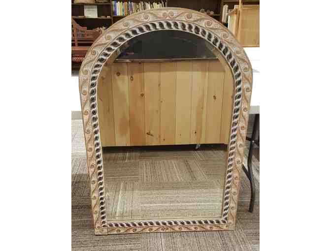 This accent piece may be just right for a wall in your home or workspace. The mirror has a hand carved wood frame, beveled glass and a charming arched top. Vertical dimensions are 32" W x 45" L.