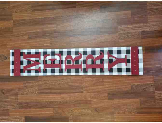 "Merry" Outdoor Sign in Black and white plaid with red "Merry" letters