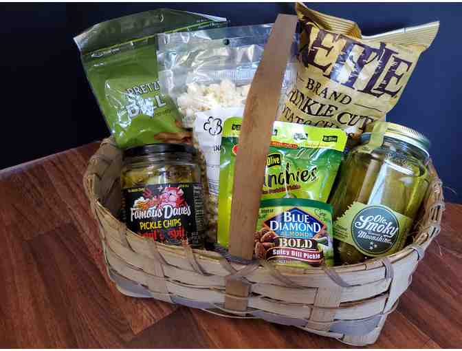 If you love dill pickles this is the basket for you! Includes: dill pickles flavored pretzels, popcorn, chips and almonds. Munchies portable dill pickles, Ole Smoky Moonshine Pickles, Famous Dave's Devil's Spit Pickle Chips!