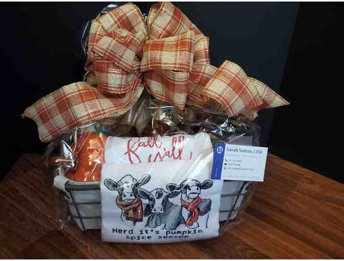 Ring in the fall with this awesome basket full of coffee syrups, embroidered towels, coffee cup, pumpkin decor, and coffee!
