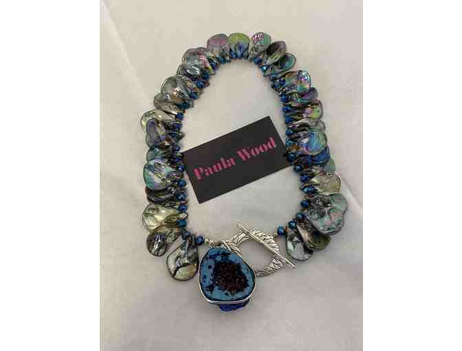 This gorgeous necklace is bound to make a statement. This necklace features dyed mother of pearl with a durzy quartz drop.