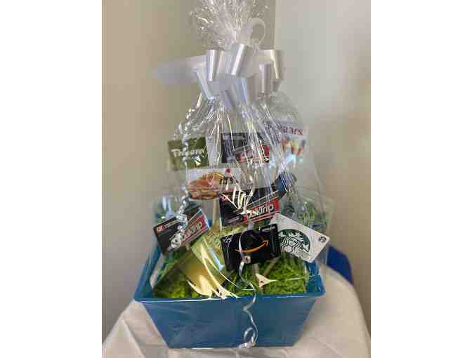 This gift basket contains gift cards to Tulsa favorites such as Braums, QuikTrip, Panera, and Starbucks. Also included a bottle of pinot grigio and a couple of wine glasses.