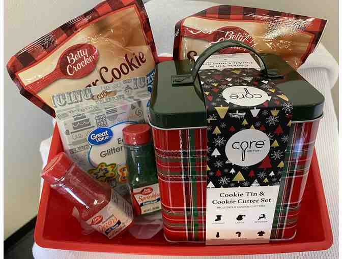 Contains cookie tin, six cookie cutters, sugar cookie mixes, red & green sugar, and glitter gel.