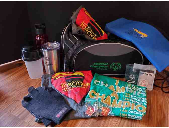 Show your support for Special Olympics Arkansas with this goody bag! Included: stainless steel tumbler, protein shaker, water bottle, texting gloves, pop sock, phone sleeve, draw string backpack, duffel bag, knights of Columbus SOAR 50th commemorative pens, t-shirts 2xl, small, and xl!
