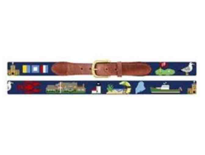 Make a fashion statement with custom Kennebunkport/Kennebunk belts made by Smathers and Branson. Custom made for Hurlbutt Designs, the belts include scenes from St. Ann’s Church, Walker’s Point, and other local interests. The winner will go to the store with the given certificate and pick size of belt or can order whatever size they need.