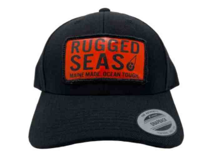 This six panel snap back features the Rugged Seas logo overprinted on recycled bib material.