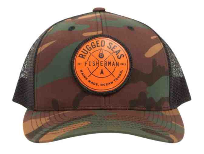 This six panel snap back features the Rugged Seas logo overprinted on recycled bib material.