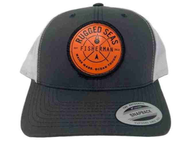 This six panel snap back features the Rugged Seas logo overprinted on recycled bib material.