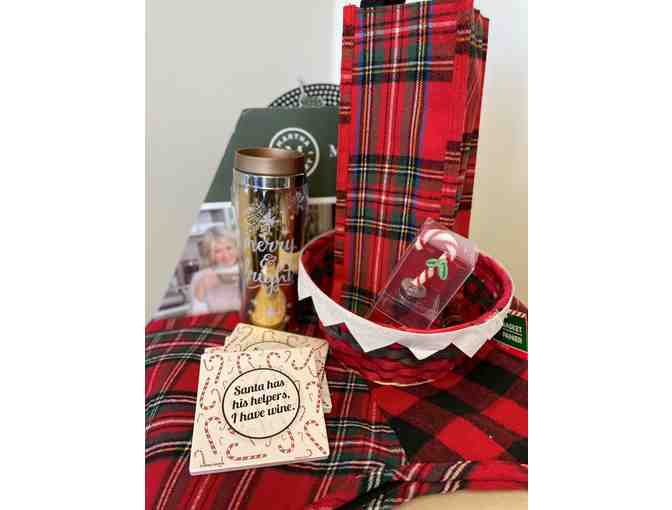 Bundle includes Martha Stewart plaid Christmas skirt, plaid wine bag, candy cane bottle stopper, Merry & Bright thermal tumbler, four coasters, and a Christmas basket.