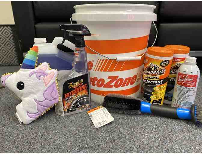 Includes bucket, car wash fluid, ArmorAll original wipes, ArmorAll glass wipes, Meguiar's Hot Shine tire spray, Spoke and Rim brush, SeaJoan Motor Treatment, Unicorn Wash & Dust Pad