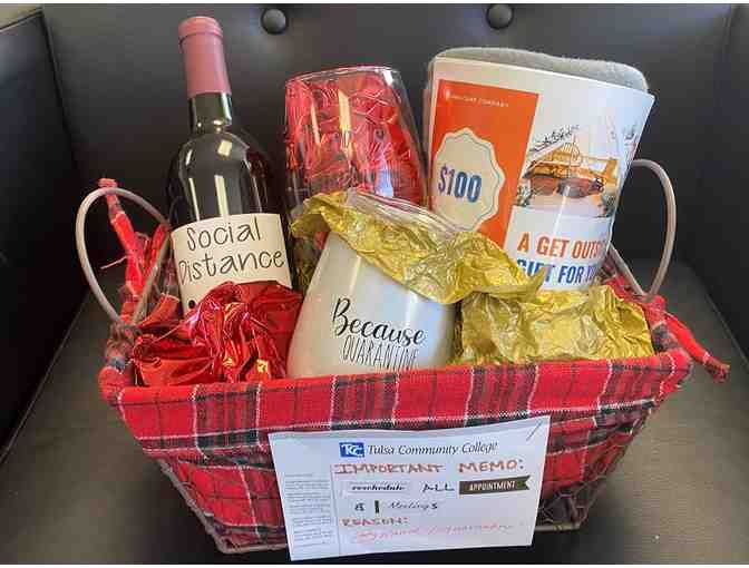 The Quarantine Night Out in your Backyard basket includes a beautiful white wine tumbler that says Because Quarantine on the front, a stemless wine glass for your guest that has Because Quarantine etched on the front of the glass, an amazing bottle of Social Distancing red wine from the Waters Edge Winery and a $100 gift card to Homma Camp Co for your backyard campout.