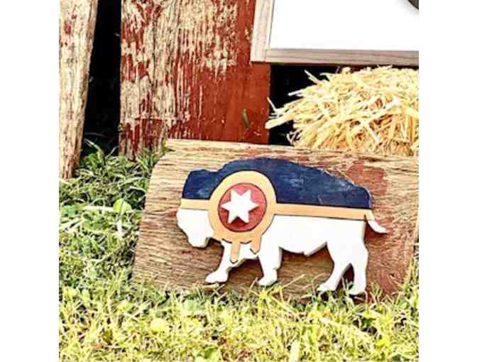 This bison featuring the Tulsa flag is mounted on wooden planks and it sure to be a conversation piece. Hand-cut and hand-stained, this bison is mounted on reclaimed Claremore, Oklahoma, barnwood.