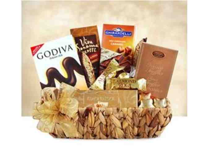 Includes: Godiva caramels, Creamy Jacquot truffles, a Ghirardelli milk chocolate and caramel bar, Biscotti, Almond Roca, and Gold foil wrapped chocolate stars