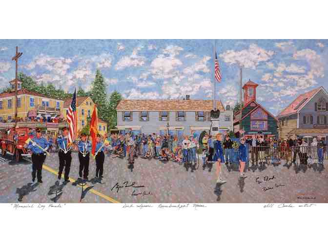 Former President George Bush and First Lady Barbara stand in their usual spots to observe this Memorial Day parade through Dock Square Kennebunkport in artist Will Cunha's print, "Memorial Day." (And I Spy George W. looking on! Can you find him?) Both George Bush and Barbara Bush, plus George W. and Laura Bush, signed the original which this print includes.