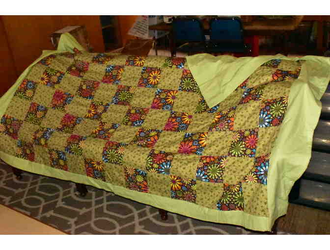 This wonderful colorful handmade queen-sized quilt created by Danielle Szczepanik of Newmarket, New Hampshire in 1995. The quilt has never been used. Donated by Jeanne Lilienthal on our Board of Directors who commissioned its creation.