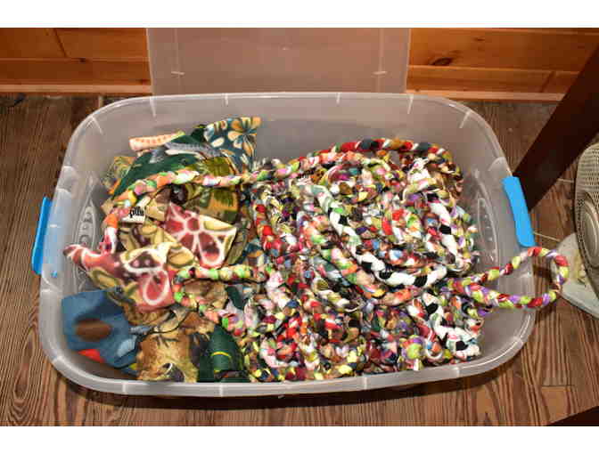 Rag Rug Kit -This rag rug was begun by Jeanne Lilienthal at Camp Cavell at a Fall Women's Weekend about fifteen years ago. The "Kit" includes approximately 157 feet of a braided fleece rope and a HUGE amount of fleece scraps waiting to be cut and braided. The pieces are from a variety of the many colors and patterns used in Jeanne's Comfort Blankets.